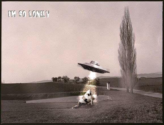 Okay let me set this straight: The saucer is not frying the cow's backside. I've desperately modified the pic to make it look as much like it's trying to pick up the cow with it's tractor beam as possible... The cow is actually from a pic of a cow trying to eat grass under a fence. The landscape was from somewhere unknown, and the flying saucer is just your average curry-tins-and-Sellotape-look-it's-real-honest grade alien spacecraft. |